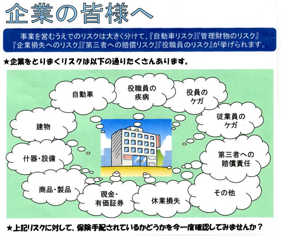 先ずは、どんなリスクと保険があるか、個人、企業ともに確認してみてはいかがでしょう?